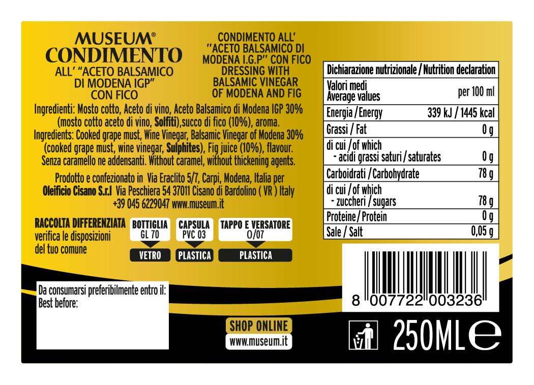 The Balsamic Dressing of Modena with Fig, unites the intensity of aged vinegar to the sweetness of the fig, creating a dense and creamy balsamic, with a pleasantly round taste.
