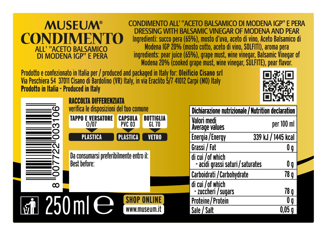 In the IGP Balsamic Dressing with Pear, the intensity of the balsamic vinegar and the delicate and round taste of the pear, create a unique and balanced contrast, giving life to a surprising vinegar, suitable for different uses.