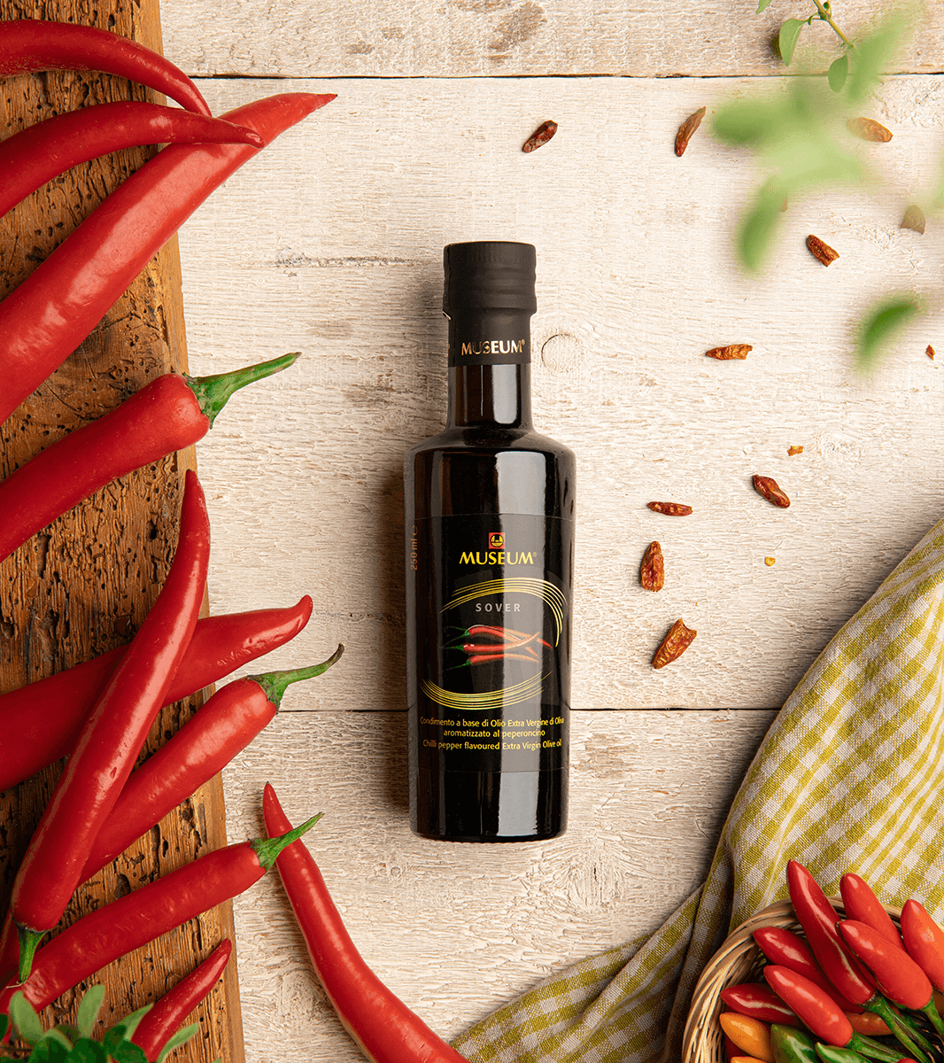 Extra virgin olive oil with chilli pepper lends itself to different uses. Perfect for giving extra oomph to grilled meat. It is also used to dress spaghetti, salads, pizzas, pulses, bruschetta and seafood.