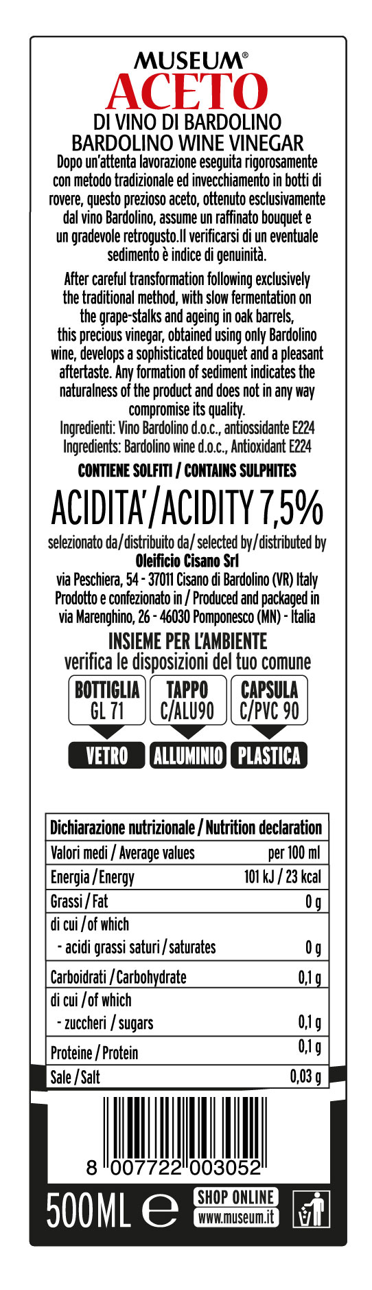 Questo prezioso aceto, ottenuto esclusivamente dal vino Bardolino con metodo tradizionale ed invecchiamento in botti di rovere, assume un raffinato bouquet e un gradevole retrogusto fruttato.