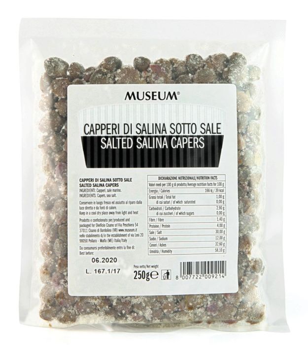 NB: Prima dell’utilizzo i capperi vanno dissalati, ossia messi in acqua a temperatura ambiente. L’acqua deve essere circa il doppio rispetto alla quantità del prodotto da dissalare e va cambiata spesso (almeno 3/4 volte). Si consiglia di assaggiare il prodotto prima di utilizzarlo.