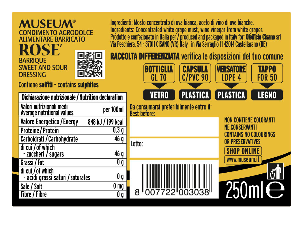 Il Condimento Agrodolce Barricato Rosé, è un prodotto pregiato, ottenuto da uve bianche ed invecchiato in botti di ciliegio che gli conferiscono il caratteristico colore rosa luminoso.